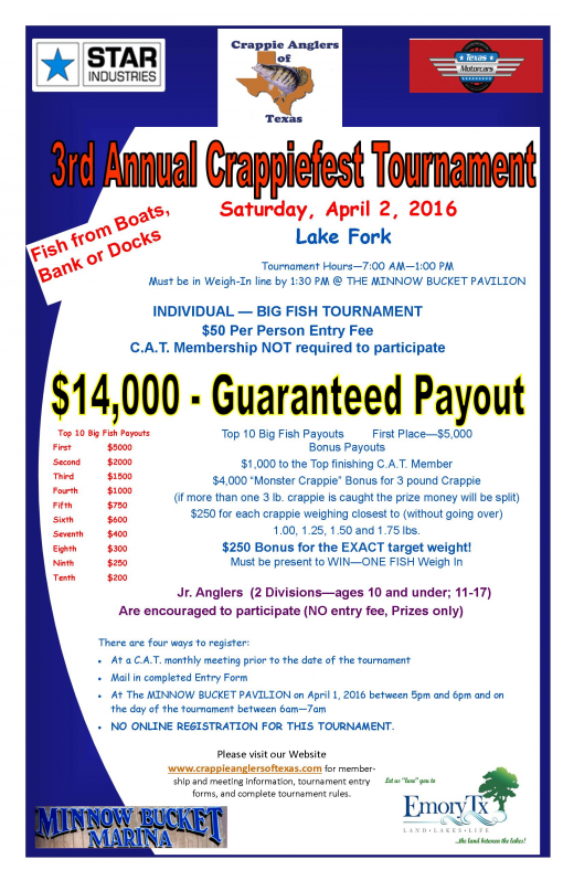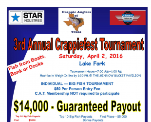 The 3rd Annual CAT Crappiefest Tournament is set for Saturday, April 2, 2016 at the Minnow Bucket on Lake Fork.