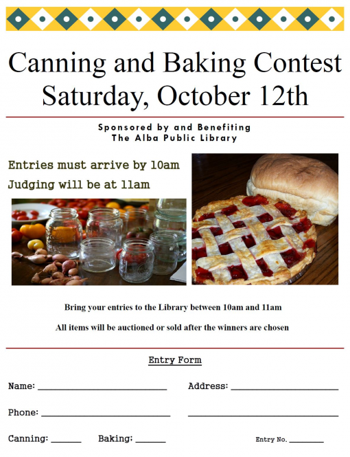 Canning and Baking Contest and Auction benefiting the Alba Public Library & Museum